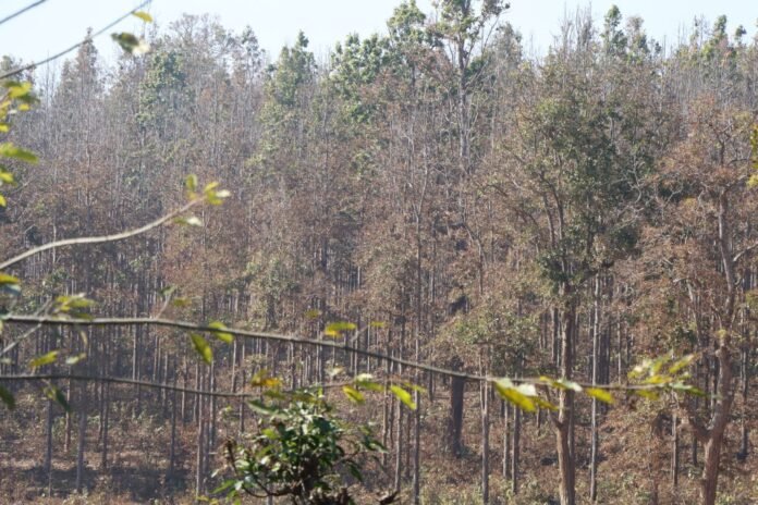 पालुवा पलाउने बेलामा सालका रूखहरू डढेला लागेका जस्ता देखिने गरेका छन् । २ सय ६० हेक्टर क्षेत्रफलमा फैलिएको उक्त सामुदायिक वनका करिब १० प्रतिशत सालहरू पातविनाका छन् ।